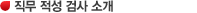 Á÷¹« Àû¼º °Ë»ç´Â ´ëÇлý »Ó¸¸ ¾Æ´Ï¶ó ÀÏ¹Ý ¼ºÀεéÀ» ´ë»óÀ¸·Î Á÷¹«ÀÚÁú°ú Á÷¹«´É·ÂÀ¸·Î ³ª´² Æò°¡ÇÏ°Ô µÇ¸ç µÎ °¡Áö »çÇ×À» Á¾ÇÕÇÏ¿© Á÷¹«Àû¼º¿¡ ´ëÇÑ ±âº» Æò°¡ °á°ú¸¦ »êÃâÇÏ°Ô µË´Ï´Ù.